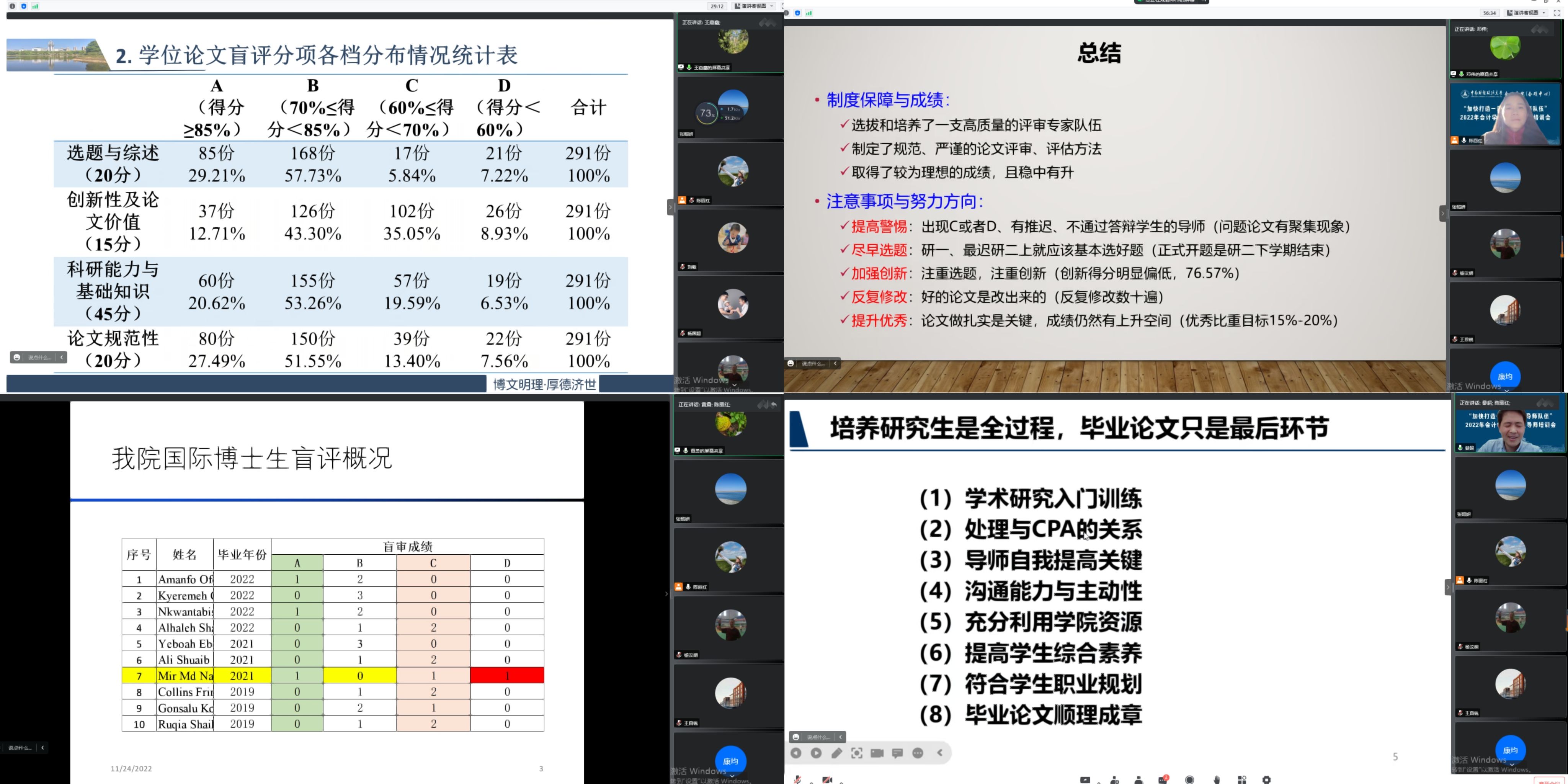 会议第二部分为研究生导师论文指导交流会。专硕导师组组长王嘉鑫副教授、学硕导师组组长邓伟副教授从论文的选题与综述、创新性及论文价值、科研能力与基础知识以及论文规范性等方面分别对学院2022年专硕和学硕研究生论文盲评情况进行了详细报告,并提出今后的改进建议和努力方向。留学生导师组组长黄勇副教授对我院留学生论文盲评情况进行了汇报,建议留学生撰写论文尽量选择中国背景的题目。