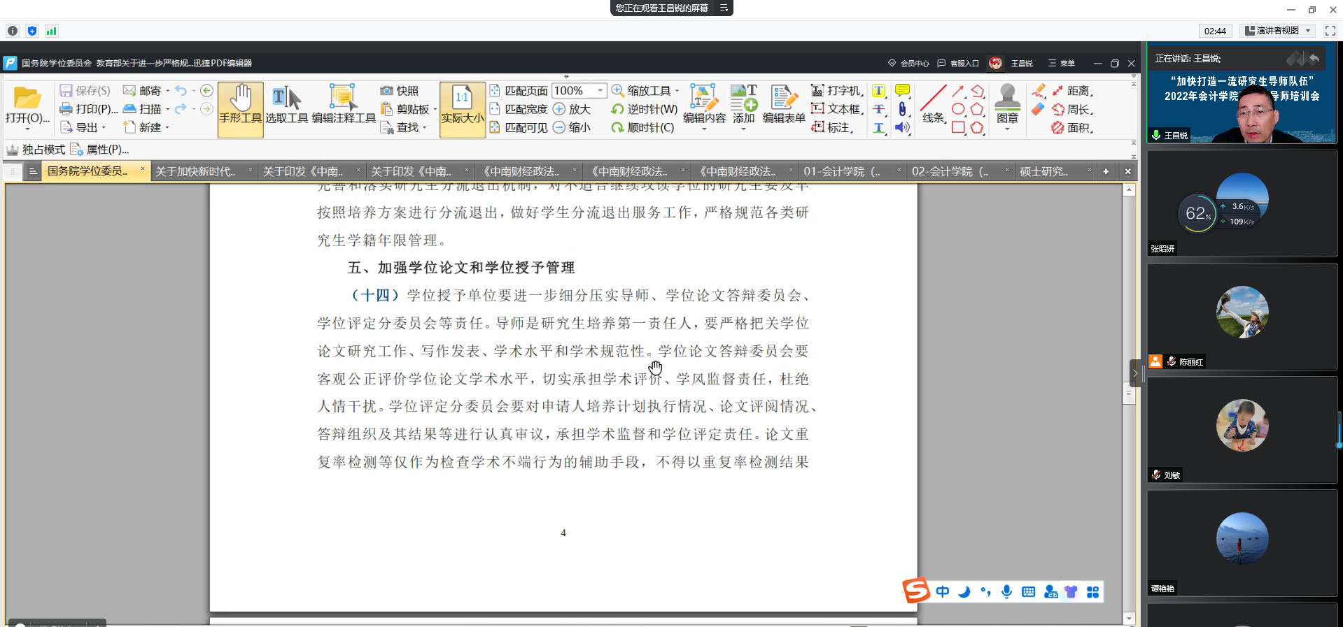 为深入学习贯彻党的二十大精神,贯彻落实习近平总书记对研究生教育工作的重要指示精神和全国研究生教育大会精神,根据学校研究生导师培训工作的通知和学院研究生导师队伍建设的总体安排,11月24日下午2点半,会计学院全体研究生导师和青年教师齐聚云端,召开“加快打造一流研究生导师队伍”2022年会计学院研究生导师培训会。本次培训会由会计学院副院长陈丽红教授主持。学院全体研究生导师和35岁以下非研究生导师参加了此次会议。
