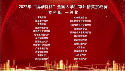 (图文:张姿颖 审核:朱昭威)2022年11月26日,由中国审计学会审计教育分会主办,南京审计大学政府审计学院承办的2022年“福思特杯”全国大学生审计精英挑战赛通过线上形式举办。来自西南财经大学、南京审计大学、广东外语外贸大学等多家高校共计390支队伍参加了此次比赛,经过两个半小时的激烈角逐,我院张姿颖、吕芷琪、任家颐三名同学组成的本科生代表队获得全国一等奖的佳绩;郭志斌、朱昭威、叶雅萌三名同学组成的研究生代表队获得全国二等奖的佳绩;王嘉鑫老师获得“优秀指导老师奖”。
