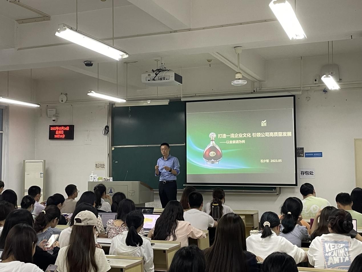 为了进一步落实产教融合育人机制,提供更多实践性、前沿性、研究性的教学内容和经验,帮助学生更好地了解行业发展趋势、前沿课题、市场需求等,培养具有创新精神、实践能力和职业素养的高素质人才,2023年5月14日17:00,会计学院产教融合育人大讲堂(第三讲)在文添楼202隆重开讲。本次讲座由博士生导师王清刚教授主持,金徽酒股份有限公司董事、副总经理石少军先生应邀主讲,以“打造一流企业文化,引领公司高质量发展—以金徽酒为例”为主题,为100余名会计学院师生作了一场精彩的学术讲座。