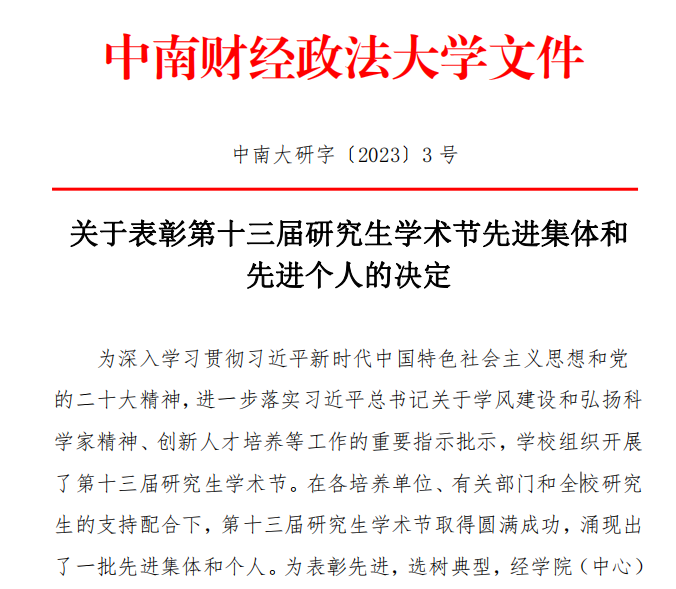 2022年11月至2023年5月,为深入学习贯彻习近平新时代中国特色社会主义思想和党的二十大精神,进一步落实习近平总书记关于学风建设和弘扬科学家精神、创新人才培养等工作的重要指示批示,学校组织开展了第十三届研究生学术节。5月16日,学校发布《关于表彰第十三届研究生学术节先进集体和先进个人的决定》,会计学院凭借优异表现,在本届研究生学术节中荣获先进集体二等奖。