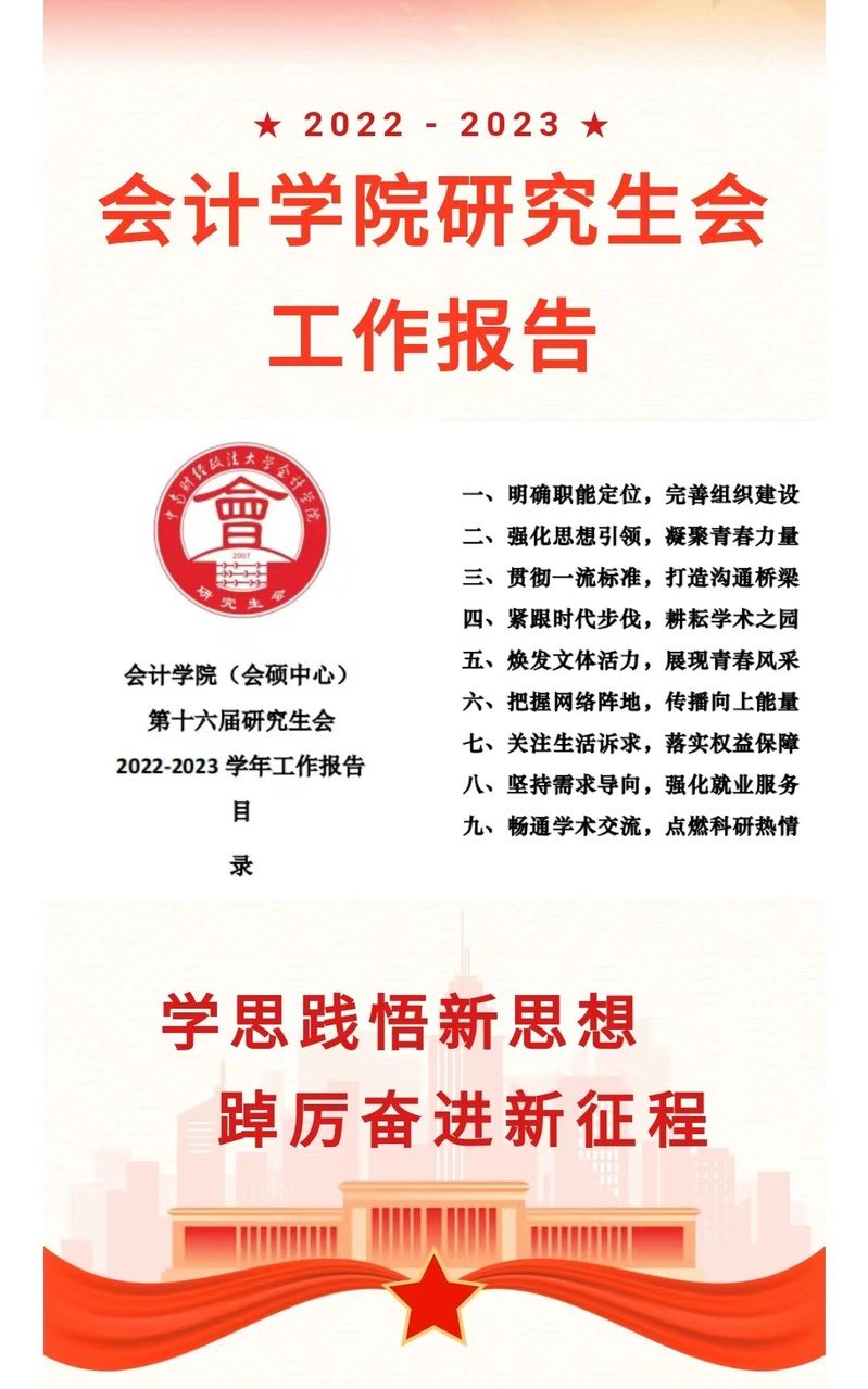 6月13日,学校印发《关于中南财经政法大学2022-2023学年研究生综合表彰的决定》,会计学院研究生会蝉联“优秀研究生会”和“优秀研究生自办刊物单项奖”,再次将集体奖和单项奖同时收入囊中。