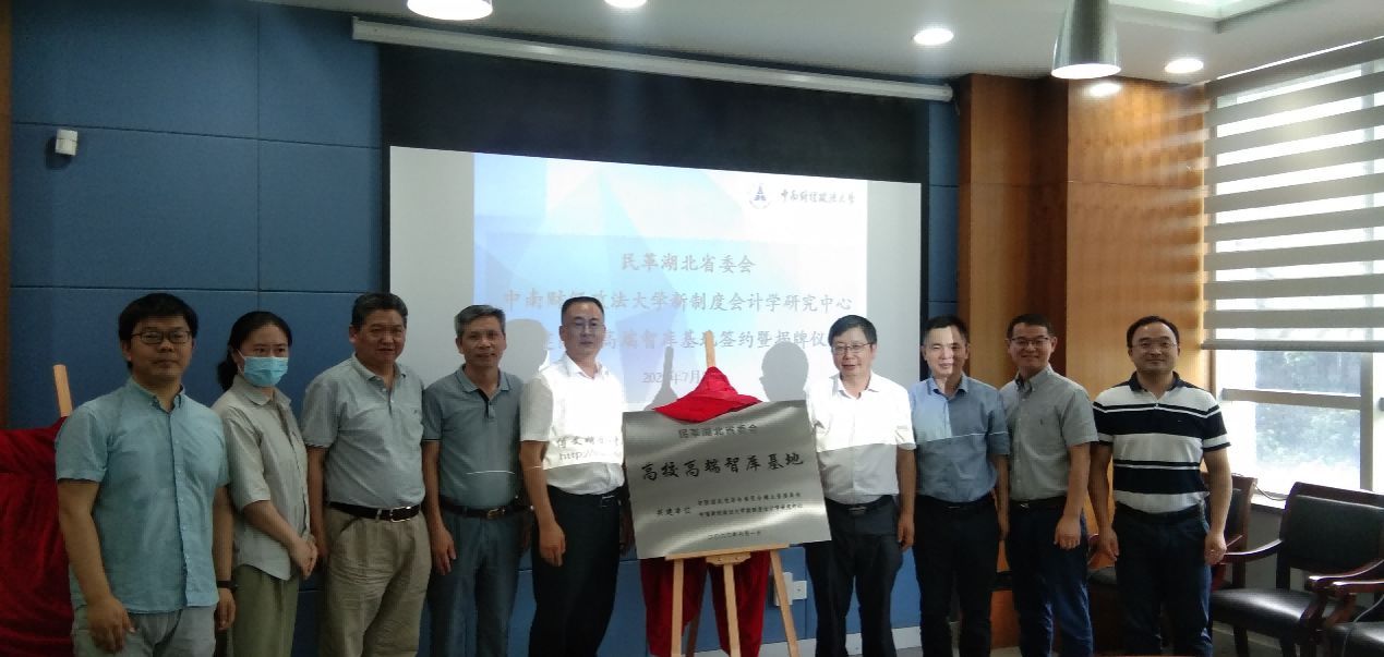 7月5日下午,民革湖北省委会与中南财经政法大学新制度会计学研究中心共建高校高端智库基地签约暨揭牌仪式在我校中原楼三楼会议室隆重举行。民革湖北省委会省政协副秘书长兼省民革专职副主委秦明山、省民革经建部部长陈发园、中南财经政法大学副校长邹进文教授、副校长周铭山教授、我校科研部部长张金林教授、社科院院长石智雷教授、科研部副部长鲁元平教授,以及我校会计学院党委周勇书记、民革中南财经政法大学支部主委李璐教授、新制度会计学研究中心主任杨国超教授以及新制度会计学研究中心博士生和硕士生全体出席签约暨揭牌仪式。