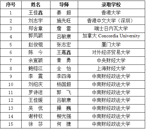 在学校大力推进“双一流”建设和深入实施研究生培养质量提升工程的背景下,我院研究生科研成果不断涌现,学术氛围愈加浓郁,学生学术志趣被大大激发,2023届硕士研究生考博再创佳绩。据统计,截至目前已有15名全日制硕士研究生被拟录取为博士研究生,录取学校有香港大学、香港中文大学(深圳)、瑞士日内瓦大学、加拿大Concordia University、厦门大学、对外经济贸易大学、中央财经大学、上海财经大学、中南财经政法大学等。