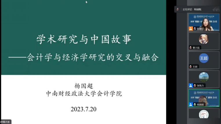 (通讯员 刘绍庆 王誉希)为进一步提升学院研究生的科研素养及科研方法,及时分享国际和国内最新实证会计研究前沿,会计学院于2023年7月20日-7月23日以线上授课的形式举办2023年“科教融合·会计学术研究”暑期学校(第二期)。20日上午和下午,中南财经政法大学会计学院教授、博士生导师,教育部、科技部111基地大数据中心主任,新制度会计学研究中心主任杨国超教授以《学术研究与中国故事——会计学与经济学研究的交叉与融合》为主题,为我们带来了一场高水平学术讲座,会计学院副院长陈丽红教授和冉明东教授共同主持会议。