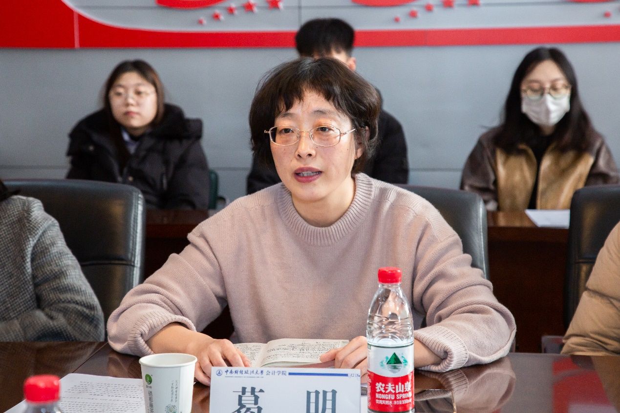 随后,葛明副部长代表党委学生工作部致辞,她表示,会计学院作为学校品牌学院,在学生资助工作方面一直保持着优良传统,希望会计学院在接下来的奖助工作中进一步完善工作机制,充分利用好社会类奖助学金的奖励先进、树立典型的作用,在持续推动学院“一融双高”建设和不断提升学生工作质量等方面取得更好成效。她鼓励各位获奖同学继续努力、积极进取、砥砺前行,成为全校、全院的青春榜样。