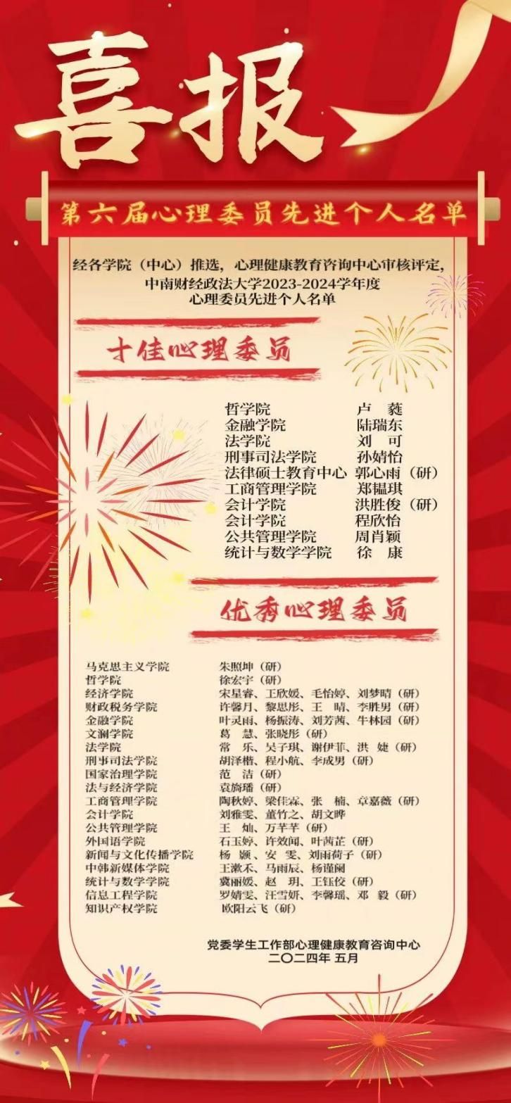 会计学院财管2102班程欣怡、会计学院2022级学硕洪胜俊等两位同学荣获学校“十佳心理委员”荣誉称号,成为学校唯一一个获评两名“十佳心理委员”荣誉称号的学院。注会2202班刘雅雯、会计2201班董竹之、会计2301班胡文晔等三位同学荣获学校“优秀心理委员”荣誉称号。