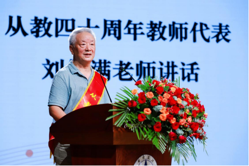 从教满四十周年教师代表、会计学院原党委书记刘仁满老师分享了从军旅生涯到会计教育的独特经历。他表示,在云南的军旅岁月锤炼了他的意志,而后的会计教育生涯则让他深感责任重大。作为会计学发展的见证者和参与者,他见证了会计学院从成立到壮大的历程,并对未来充满期待。