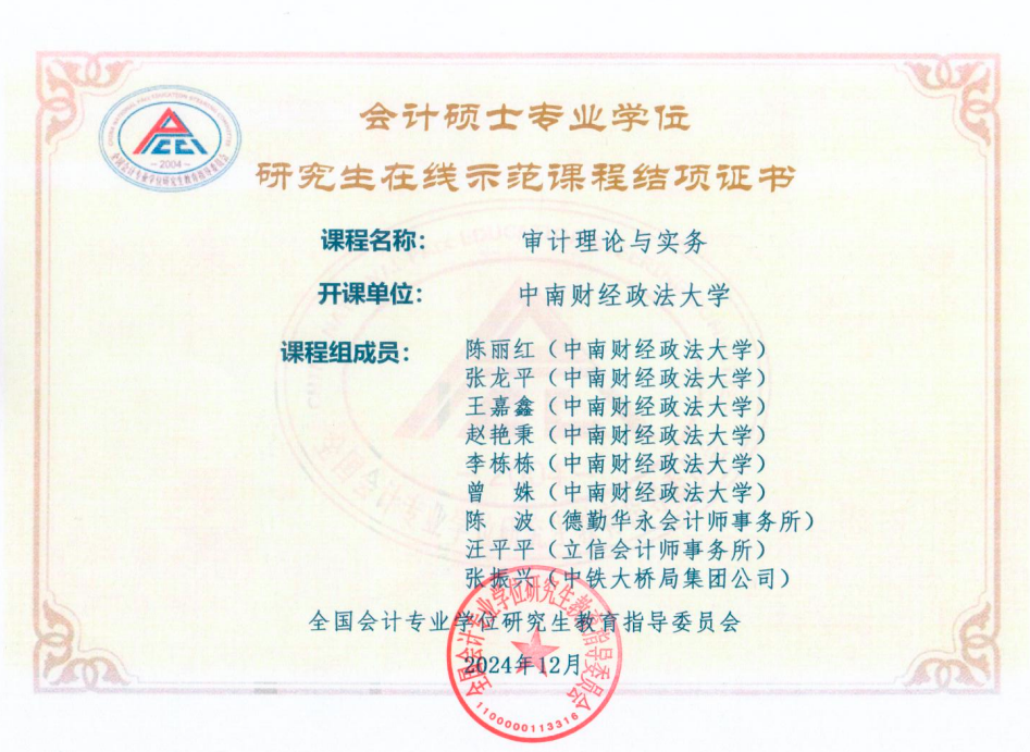 此外,学院还有6门审计专业学位研究生在线示范课程正在计划建设中。通过这些在线课程的建设,我院致力于构建新型课程育人模式,推动线上线下教学的深度融合,激发教师对课程教学质量的关注,并充分发挥课程教学在培养会计、审计专业学位研究生的专业能力、实践技能、职业素养和社会责任方面的基础性作用,从而不断提升我院专业学位研究生的培养质量。