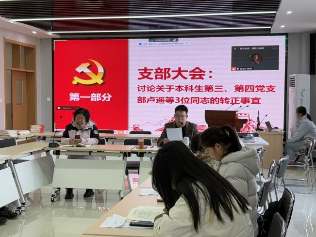 活动伊始,支部大会首先讨论了关于本科生第三党支部卢遥同志,以及本科生第四党支部李萍、韩骏腾等3位同志的转正事宜,充分体现了党支部对党员发展的严格把关和高度重视。